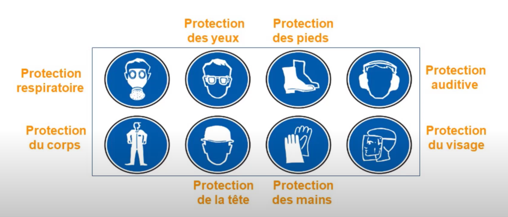 En plus ce ces trois catégories d’EPI, les EPI se divisent en huit catégories de protection : des yeux, des pieds, des mains, de la tête, du corps, respiratoire, auditive. Lorsqu’un étiquetage bleu apparaît sur les notices ou directement sur l’équipement, cela signifie que l’EPI est obligatoire.