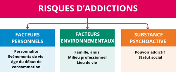 Même s’il est impossible de déterminer les causes exactes des pratiques addictives, il est certain qu’elles ont des facteurs interconnectés, comme le présente l’illustration, ci-dessous.