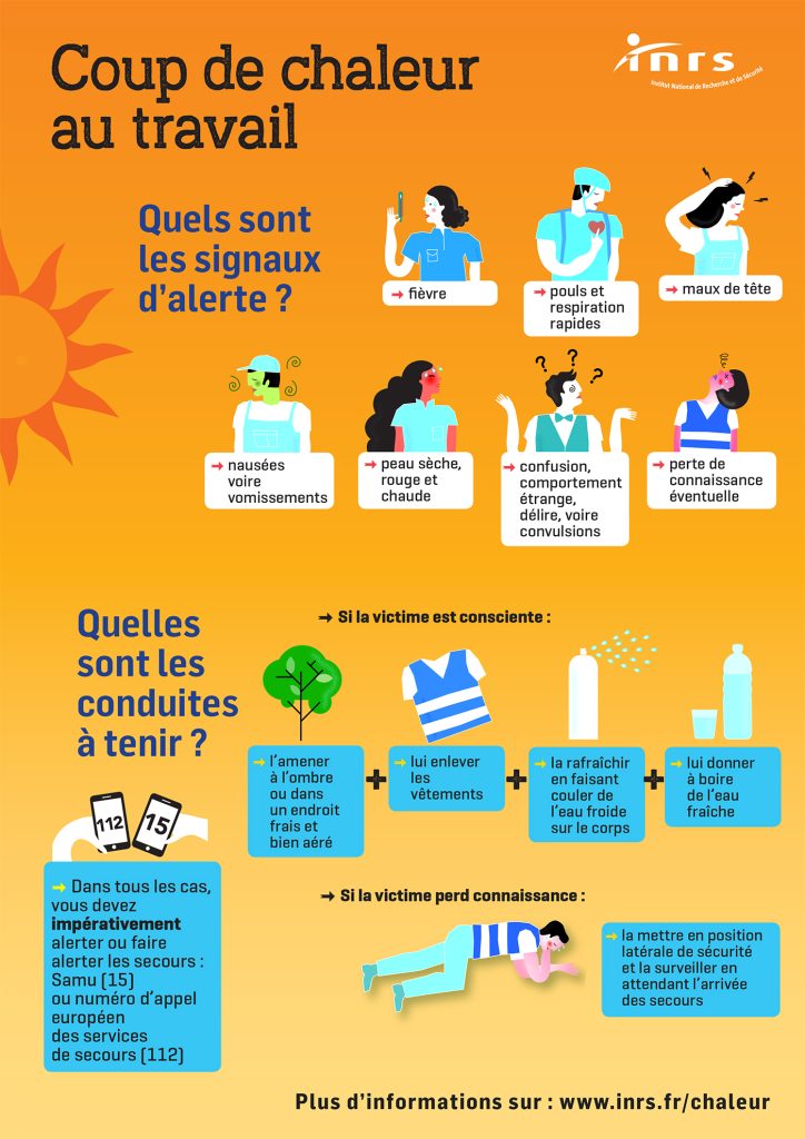 Les signaux d’alerte sont multiples : fièvre, pouls et respiration rapide, maux de tête, nausées voire vomissements, peau sèche rouge et chaude, comportement étrange, perte de connaissance éventuelle.