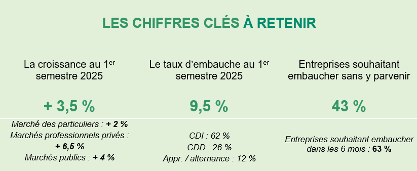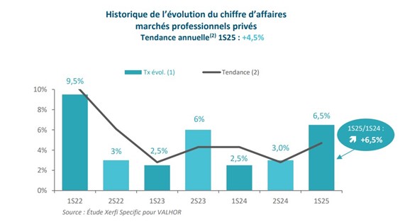 Les marchés professionnels privés (entreprises, syndics, bailleurs…) s’imposent comme le principal moteur de croissance, avec une hausse de +6,5 % par rapport au premier semestre 2024, suivi par les marchés publics, qui continuent de soutenir l’activité, avec une croissance de +4 % au premier semestre 2025.