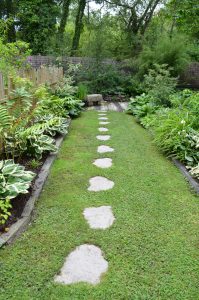 Réinterprétés dans le style européen, les pas japonais sont utilisés pour traverser une pelouse en gardant les pieds au sec, ou conserver une allée engazonnée dans les lieux de passages quotidiens. Le gazon continuera ainsi à pousser dans les joints et sur les côtés, sans risque d’être râpé au bout de quinze jours de fréquentation.
