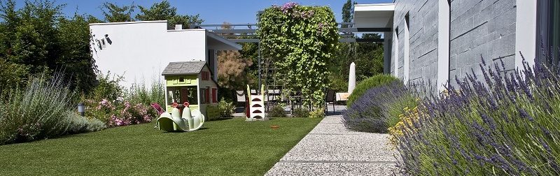 Composé avec des plantes adaptées aux climats chauds, le jardin méditerranéen rappelle les vacances que l’on passe dans le sud. C’est ce qui fait son succès depuis de nombreuses années. L’argenté des feuillages tels que ceux de l’olivier, du laurier-rose et de l’hélichryse en sont les caractéristiques, tout comme les floraisons bleues du romarin, du pérovskia et de l’agapanthe. Ce jardin fait aussi la part belle aux lavandes odorantes, utilisées en bordure, en massifs ou en longues bandes similaires à celles des champs de production. Une piscine complète souvent ce style de jardin.