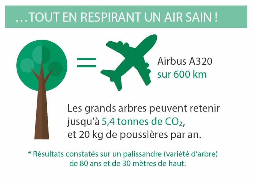 - Un palissandre de 80 ans et de 30 mètres de haut peut retenir jusqu’à 5,4 tonnes de CO2 (soit les émissions d’un Airbus A320 sur un trajet de 600 kms).